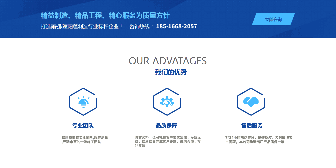 鑫建華雨棚有限公司成立于2012年,公司全體勵精圖治,飛速發(fā)展,已從初創(chuàng)業(yè)公司發(fā)展成為多元化公司,目前公司員工約1000余人,其中擁有中、高級專業(yè)技術人員100余人,形成以戶外制造產(chǎn)業(yè)為主,其他第三產(chǎn)業(yè)為輔的多元式經(jīng)營模式,旗下設有鋼結(jié)構公司,環(huán)保設備公司.其鋼結(jié)構公司主要以研發(fā),設計、生產(chǎn)、營銷、安裝、服務為一體的鋼結(jié)構生產(chǎn)制造型企業(yè),環(huán)保設備公司主要以“綠色環(huán)保節(jié)能“為核心戰(zhàn)略品牌.公司相關資質(zhì)齊備,主營業(yè)務:定制各種推拉蓬、活動雨棚、倉庫雨棚、智能電動蓬、伸縮電動噴漆房、懸空電動雨棚等手動,遙控電動一體,系列產(chǎn)品,公司總部位于中國.江蘇,目前,公司年經(jīng)營規(guī)模達8千萬以上,經(jīng)營區(qū)減已輻射全國大部份省會城市,在雨棚領域展露崢嶸,“鑫建華品牌“已成為國內(nèi)雨棚,在全國市場的占有率及品牌均名列前茅. 公司在蘇州、天津、重慶、武漢、濟南、鄭州、江門、衡陽均設有工廠,覆蓋全國主要城市、八倉生產(chǎn)制作安裝售后、國內(nèi)訂單全國范圍可上門安裝服務、國外訂單可派工程師出國指導安裝....